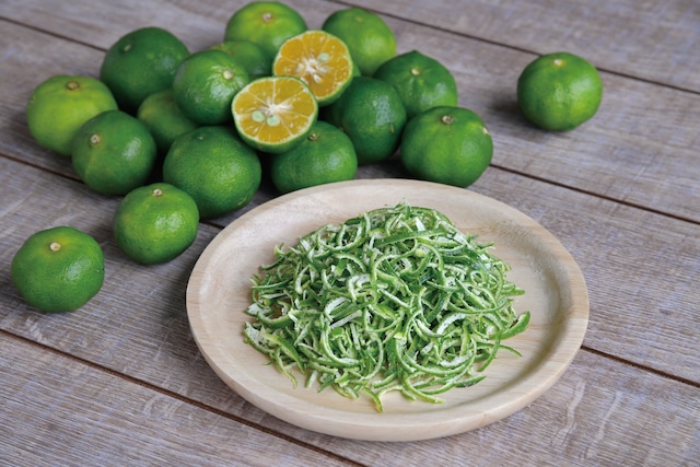 当初お客様のウェルカムドリンクとして出していたシークヮーサージュースですが皮は捨てていました。しかし、皮には認知症予防効果があるといわれているノビレチンを始めビタミンC等の栄養素が沢山含まれているのに「 捨てるのはもったいない!」「何とか有効活用したい!」と思ってマーマレードを作り始めた。