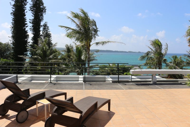 ロビーのブーゲンビリアや観葉植物に癒やされお部屋に入ると、窓ガラスの向こうには青い海と空、そよ風に揺れるヤシの木🌴