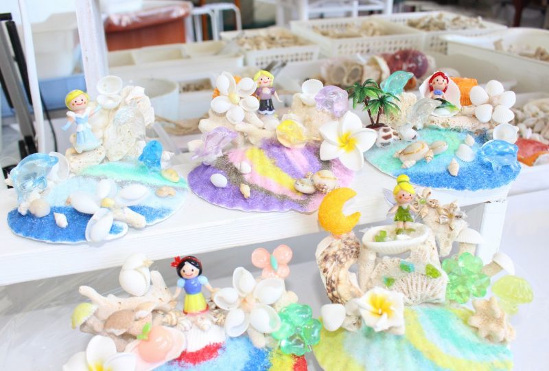 ホテル館内には手作り体験コーナーがあり、とても可愛いディスプレイを見つけましたよ!貝殻にプリンセス達がそれぞれのカラーで彩られており、本当に可愛いかったです。