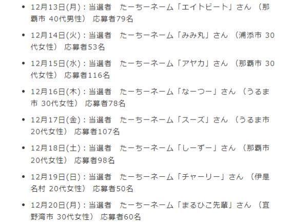 12月13日~12月20日までの当選者のたーちーの皆様の発表です!