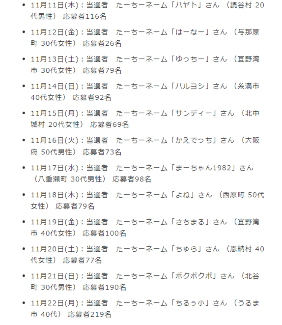 さっそく11月11日~22日までの当選者のたーちーの皆様の発表です!