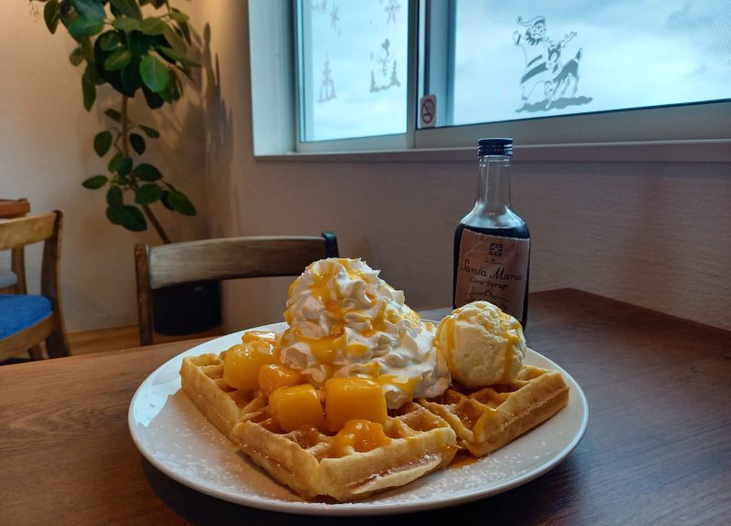 さっそく朝から楽しみにしていた恩納村産マンゴーのサクサクワッフルが運ばれて来ました♡