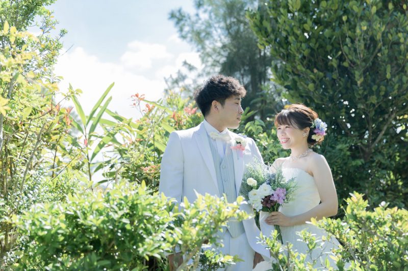 恩納村の透き通ったエメラルドグリーン海と、緑豊かな自然の中のお写真のお二人、どちらも素敵なお写真ですね。