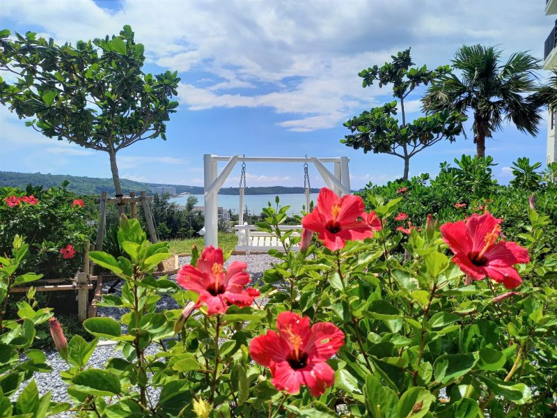 青い海と青い空、そしてハイビスカスに囲まれた緑豊かな絶景スポットです。
