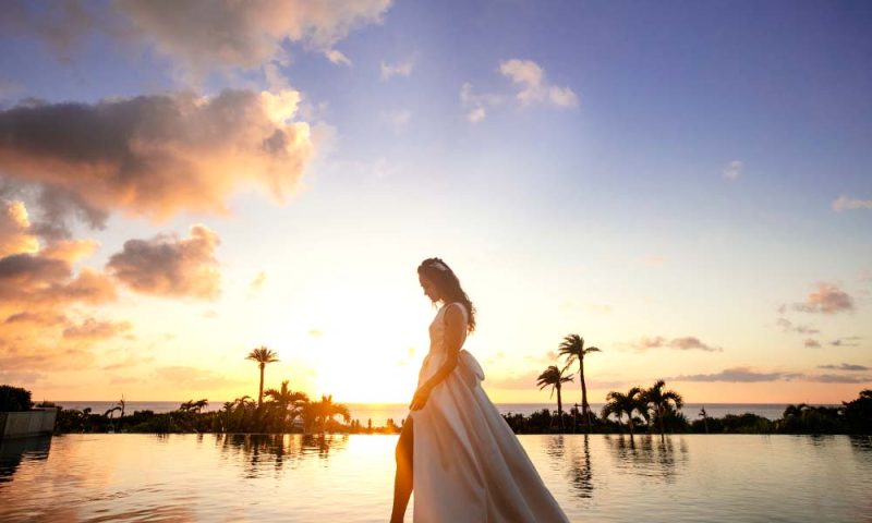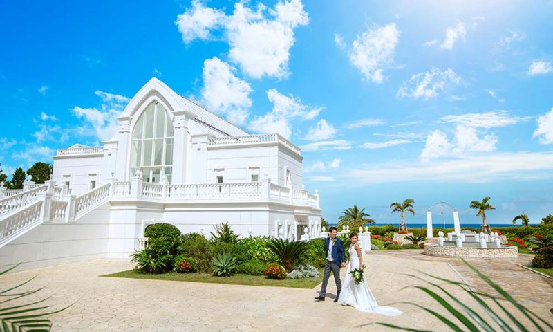 真っ白に煌めくバージンロードの奥には見渡す限りの青い水平線が広がり、圧巻のコントラストをお楽しみいただけます。
