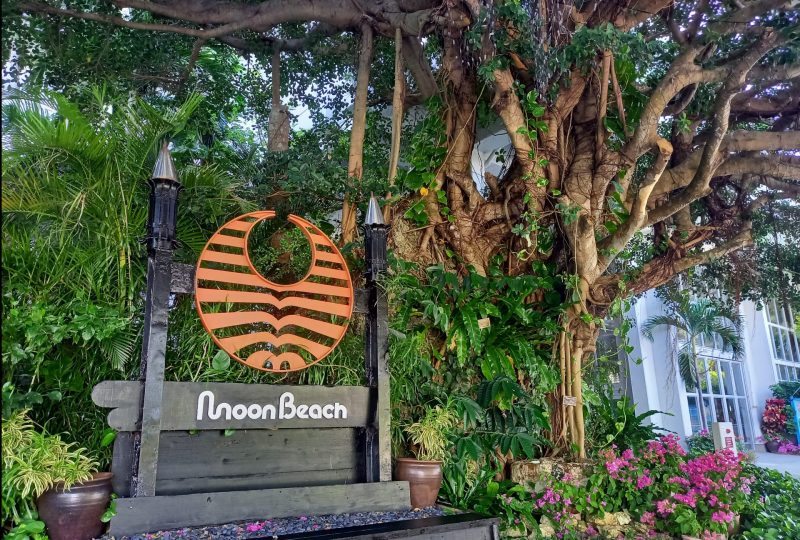 美しい自然に囲まれた最高のロケーションと、三日月型の天然ビーチを抱くように建つ「ホテルムーンビーチ」。ホテル全体が緑豊かな木々や、お花で溢れていました。
