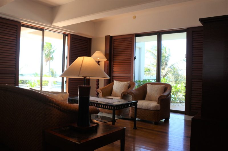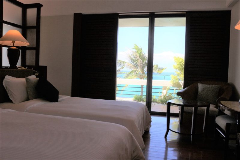 さっそくお部屋に案内してもらい扉を開けると、窓ガラスの向こうに青い海と空、そよ風に揺れるヤシの木が目に飛び込んできました。