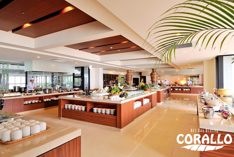 自然と一体となった開放的な造りで、潮風に揺れるヤシの葉と青い海を眺めながらオープンキッチンのライブ感とともに、和洋中琉の多彩な料理を堪能できるリゾートダイニングです。