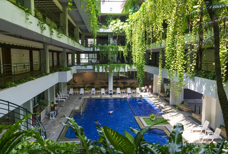 クラシカルな半屋外「アトリウムプール」は、緑のカーテンが風になびき、とても神秘的な空間でした。