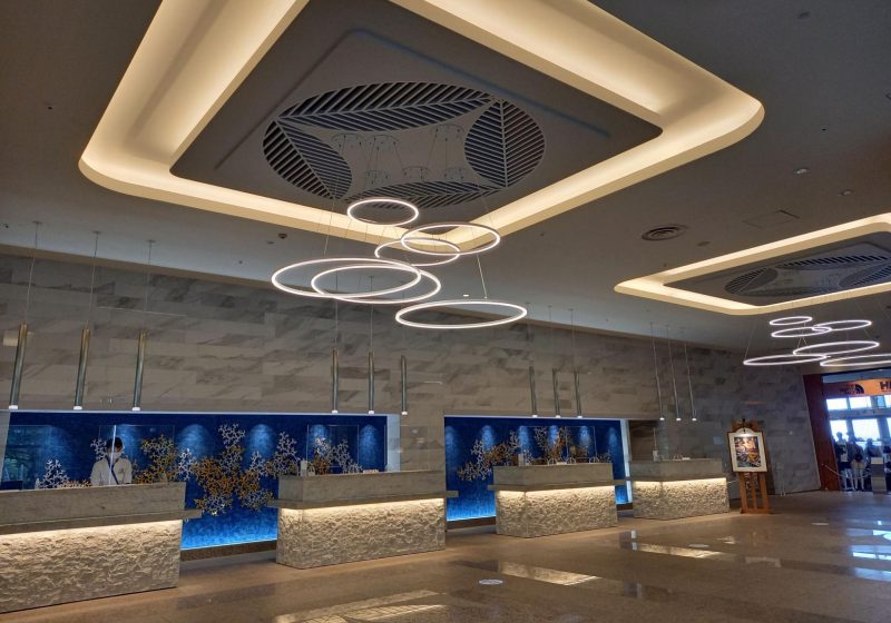 天井は波打ち、両サイドの柱は水面の揺らぎを表現。水中を潜っていき、アクアリウムのロビーへと進んで行きます!