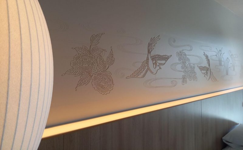 ベッドの壁面には、沖縄らしい紅型の伝統柄が刻み込まれておりました。