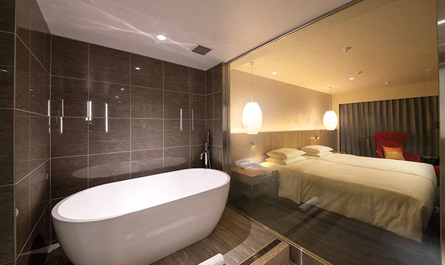 開放感のあるガラス張りバスルームは、瞬間調光ガラスパテーションとなっており、スイッチひとつで透明ガラスが不透明ガラスへと早変わりします!
