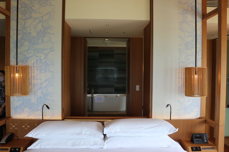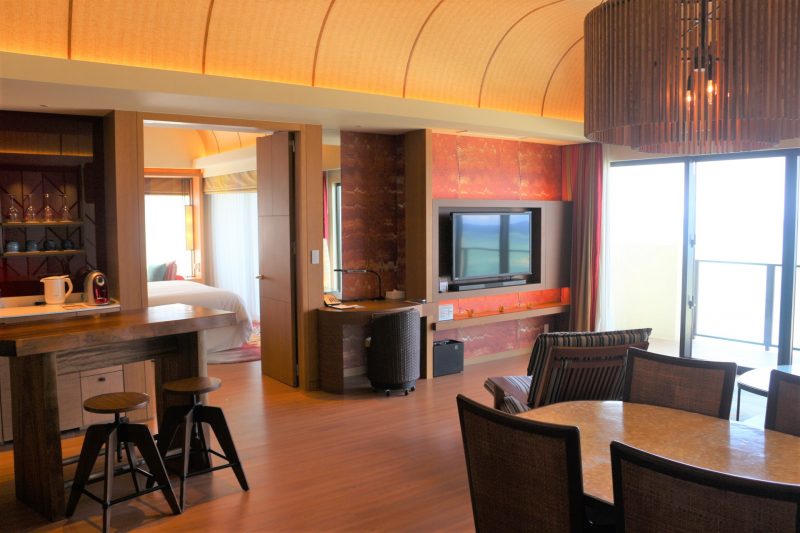 リビングルームとベッドルームからなる100㎡のお部屋は、天井も3mと高く、柔らかい間接照明でゆったりとした空間となっておりました。