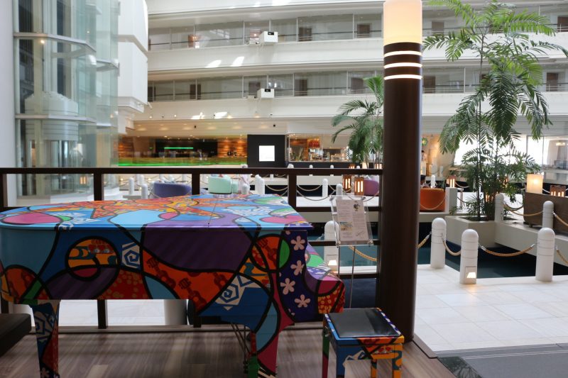 開放感のあるロビーには、ディアマンテスのボーカル、アルベルト城間さんがペイントしたピアノが展示されておりました。