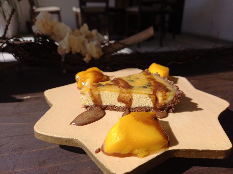 食後に、恩納村産のパッションフルーツを贅沢につかったRaw &veganパッションフルーツケーキです🎵