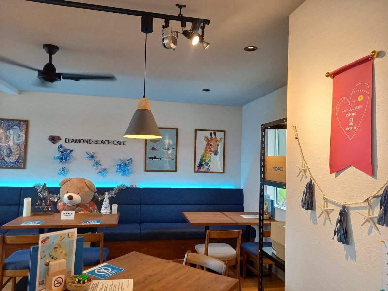 ダイヤモンドビーチまで10秒! 店内からはどこからでも美しい海が堪能できます! テラス席は水着でもOK。 ウエットスーツもOK。