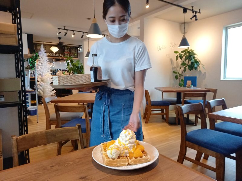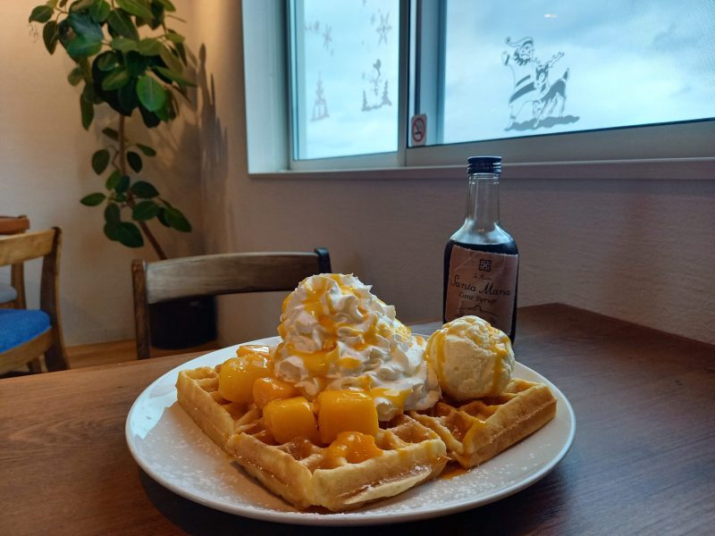 さっそく朝から楽しみにしていた恩納村産マンゴーのサクサクワッフルが運ばれて来ました♡