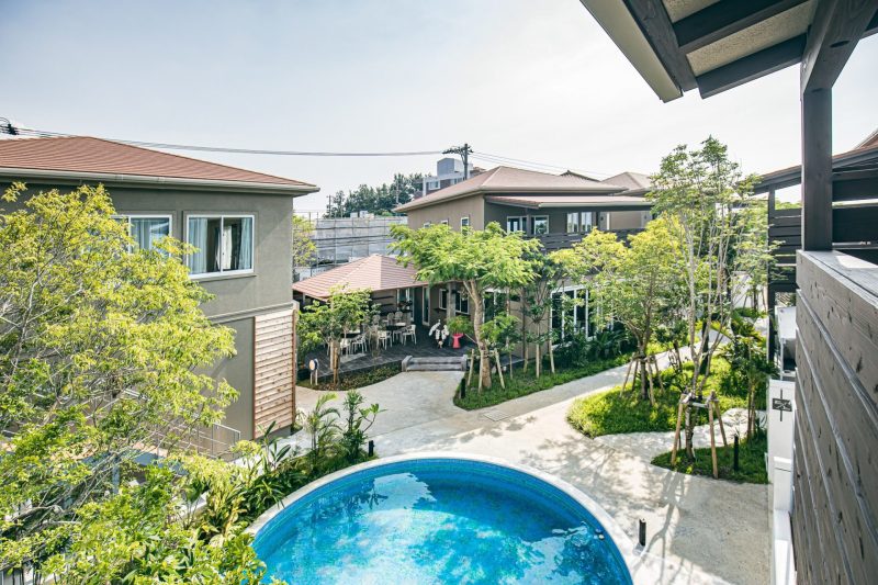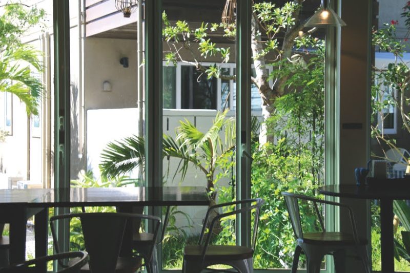 食器や内装にもこだわっており、タイ感溢れる食器や沖縄の紅型のアートを飾っています。中庭には緑とプールがあり、南国の雰囲気をお楽しみ頂けます。