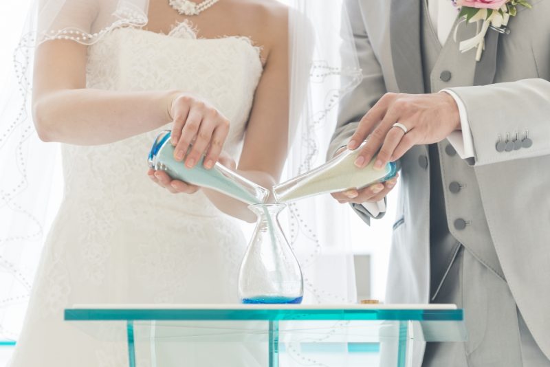 ふたりらしさが形に残る「サンドセレモニー」は、2色の砂をお二人で琉球ガラスボトルに注いで頂きます。2色がバランス良く混じり合ったり、1人が早く入れるとお色が偏ったりと、お二人らしさが出てとてもおもしろいなぁ♡と思いました。