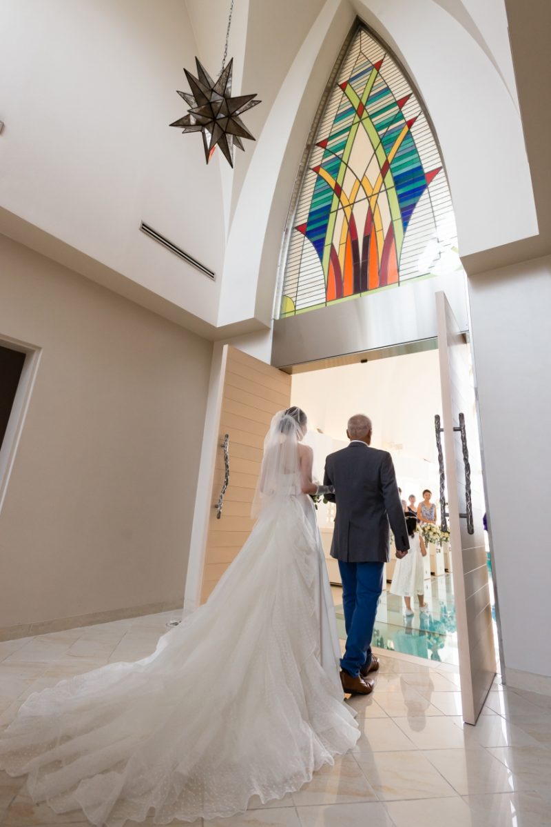 扉を開きますと、目の前には真っ白なチャペルにブルーのバージンロード。ガラス張りの祭壇の向こうはコバルトブルーの海。真っ白なウェディングドレス姿が映えますね。