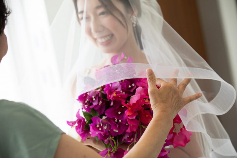 親御さんからご祝福のお言葉をもらい、行ってらっしゃい。とベールをお顔の前に掛けて頂きます。感動ですね。
