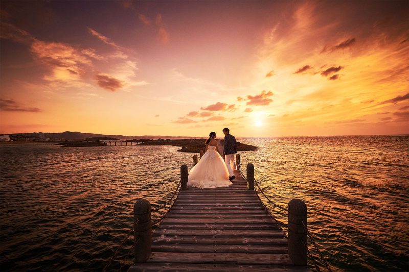 サンセットの撮影が出来る場所は、灯台と桟橋の2ヵ所あり、日が沈む瞬間は一度きりのシーンとなりますので、どちらも1日1組限定のご予約となります。昼間のエメラルドグリーンの海とは違う表情の海で、最高のお写真を!