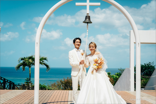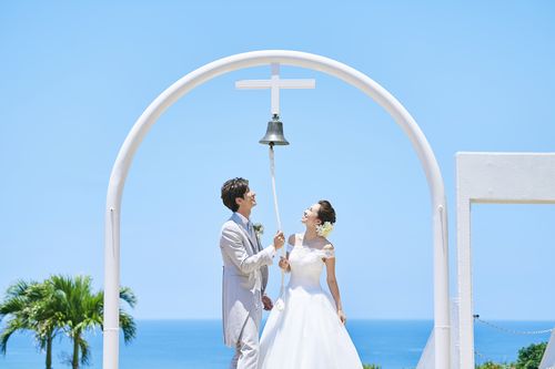 挙式の後は、チャペル横の広場でウェディングベルを鳴らし、皆様にさらにご祝福して頂き撮影タイムとなります。海と空をバックに、こちらで集合写真もお撮りします。