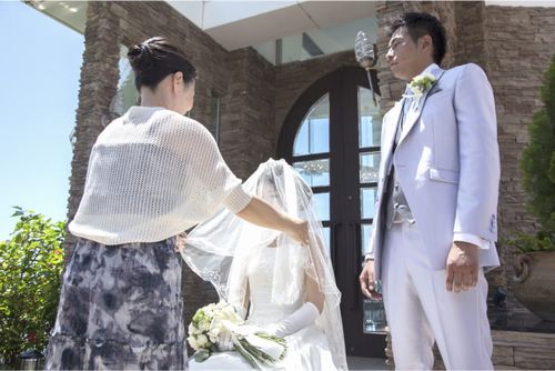 ①つ目は【アフェクションベール】挙式のご入場の前に、これから新しい家族に向かう愛娘へ「幸せになってね」と、お母様から愛情が包みこまれたベールをかぶせて頂き、感動の挙式がスタート!