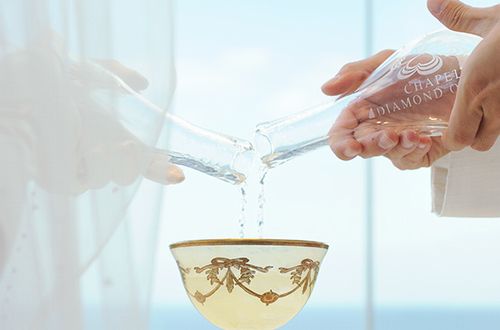 ②つ目は【水合わせの儀】ご両家の「水」を1つの器に合わせ、「ご両家の水が合いますように、早くなじみますように」と願いを込めて行います。