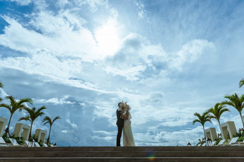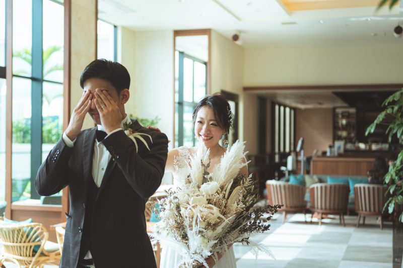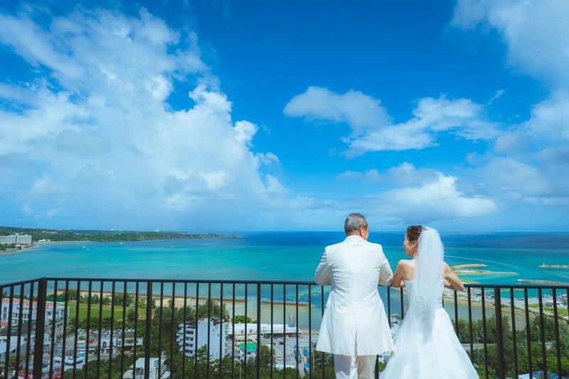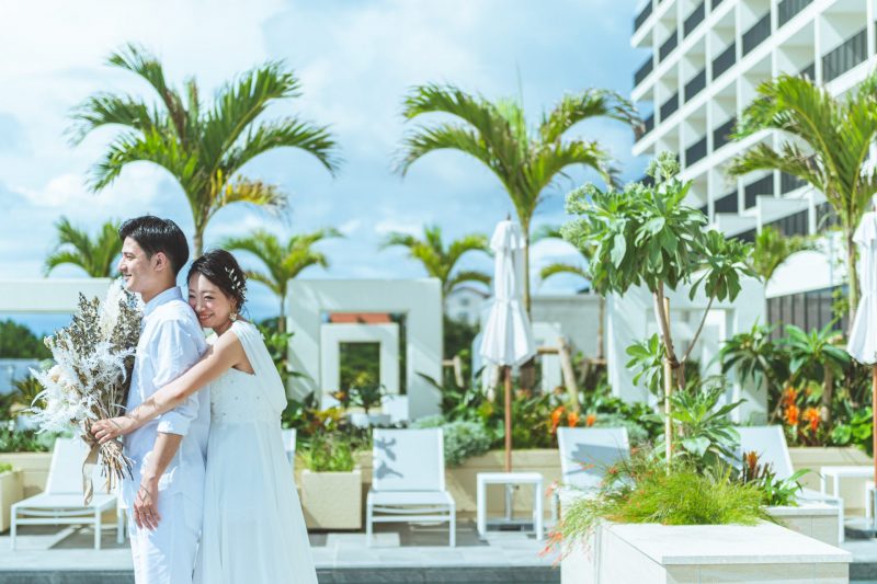 お二人の様子:12階スイートルームからの眺望と、青い海を背景にした撮影を楽しんで頂けました。ロケーション撮影では可愛らしい地域猫のお出迎えに始まり、2つの表情を見せてくれるビーチに感動するお二人。当日は撮影クルーもびっくりするほどの暑さで日陰での撮影を挟みながら撮影を楽しんで頂きました。