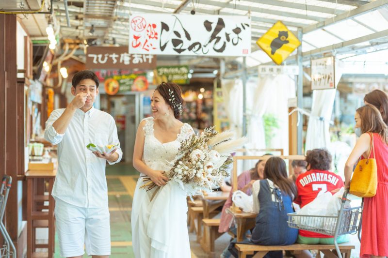 お二人の様子:お持ち込みの衣装・アクセサリーをご利用のお二人。ホテル館内撮影とぴったりのカラーコーディネートでした。ロケーション撮影ではお持ち込みのアイテムを活かしつつ撮影。撮影中に小学生が釣った魚やカニを見せに来てくれたり、地元の方との小さな交流にも喜んで頂けました。