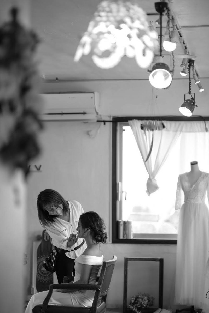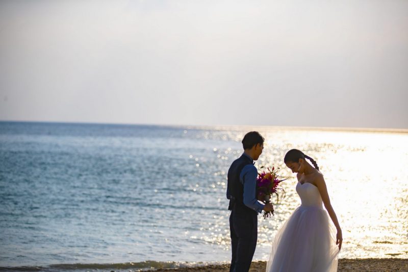 在住エリアのお近くのサロンにて、事前に衣裳のご希望、プランをヒアリングし、お打ち合わせ+衣裳決定→撮影当日、ヘアメイク→チャペル・ホテル館内撮影→ビーチ撮影(※チャペル+ビーチプランの場合)