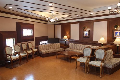 チャペルまでご到着されますと、1階は船内をイメージした雰囲気のご親族様控え室となっております。ゲストは挙式のお時間までお散歩を楽しんだり、海を見て過ごす方が多いので、お外に椅子を並べてゆっくりして頂いております。
