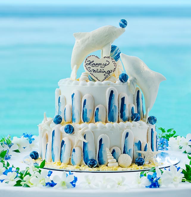 【イルカが暮らす沖縄リゾートホテル ルネッサンス リゾート オキナワ】ならではの、こちらのブルーのイルカのケーキ!ドルフィンセレモニーとセットでお願いしたいですね。