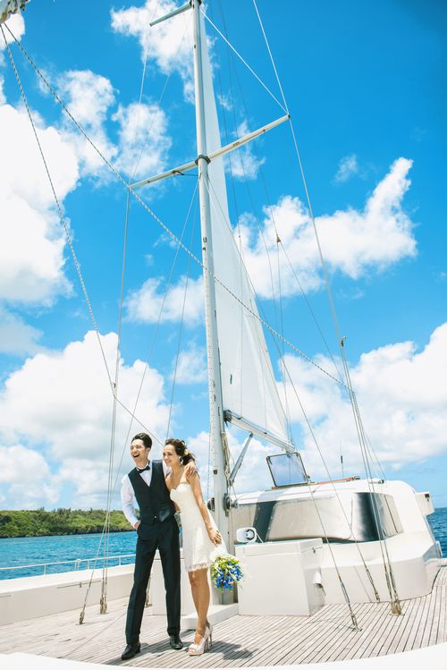 海が大好きなお二人に大人気のプライベートクルージングもありますよ。船の上でドレス姿のお写真、とっても素敵ですね。