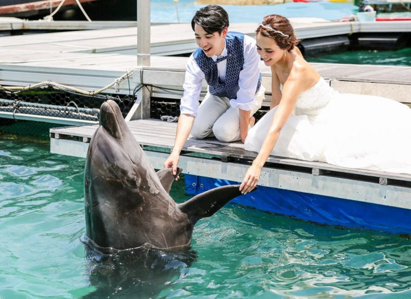幸せいっぱいのお二人の為に、イルカからのご祝福♡ ドルフィンセレモニーでイルカと触れ合い、一緒に写真撮影が出来ます。