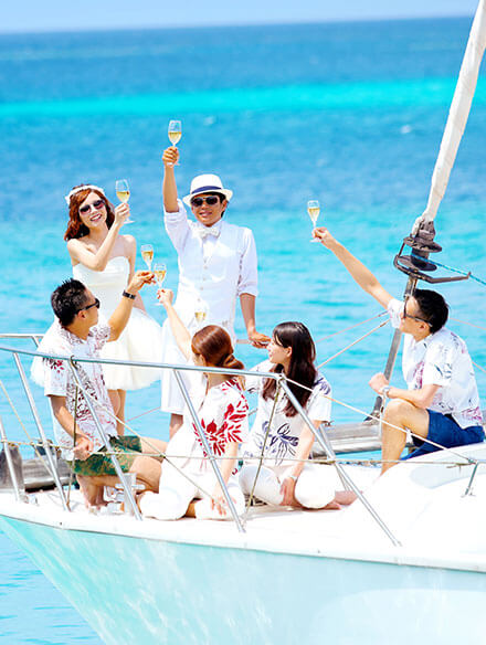 マリンブルーの海の上で、シャンパンで乾杯!など、空と海との空間で思いっきりリゾートウェディングをお楽しみ頂けます。ご親族の皆様や、親しいご友人もご参加頂けますね。