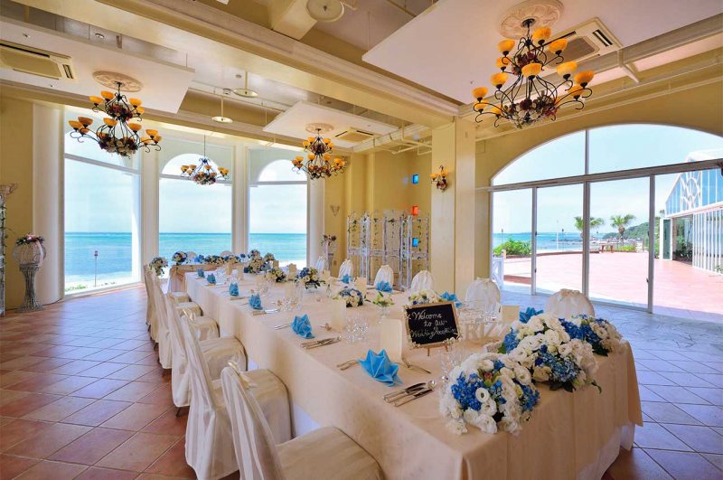 チャペル1階の【マリアージュルーム】は、目の前にはリザンブルーの海、室内はとても可愛らしい内装とシャンデリア♡収容人数は40名様となっております。
