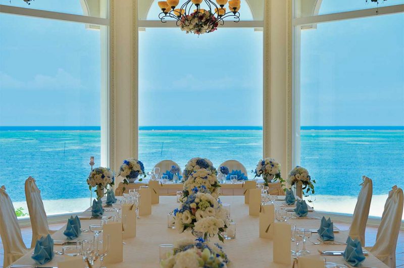 【啓泰の間】は、ゲストとのふれあいを楽しめる収容人数20名~100名様の、アットホームなウェディング会場となっており、大きなガラス張りの室内から見える海と空もポイントとなっております。