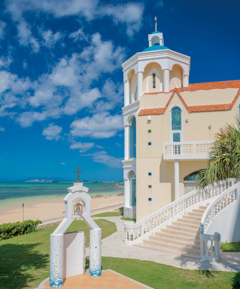 コバルトブルーの海を望む、真珠のように輝くチャペル